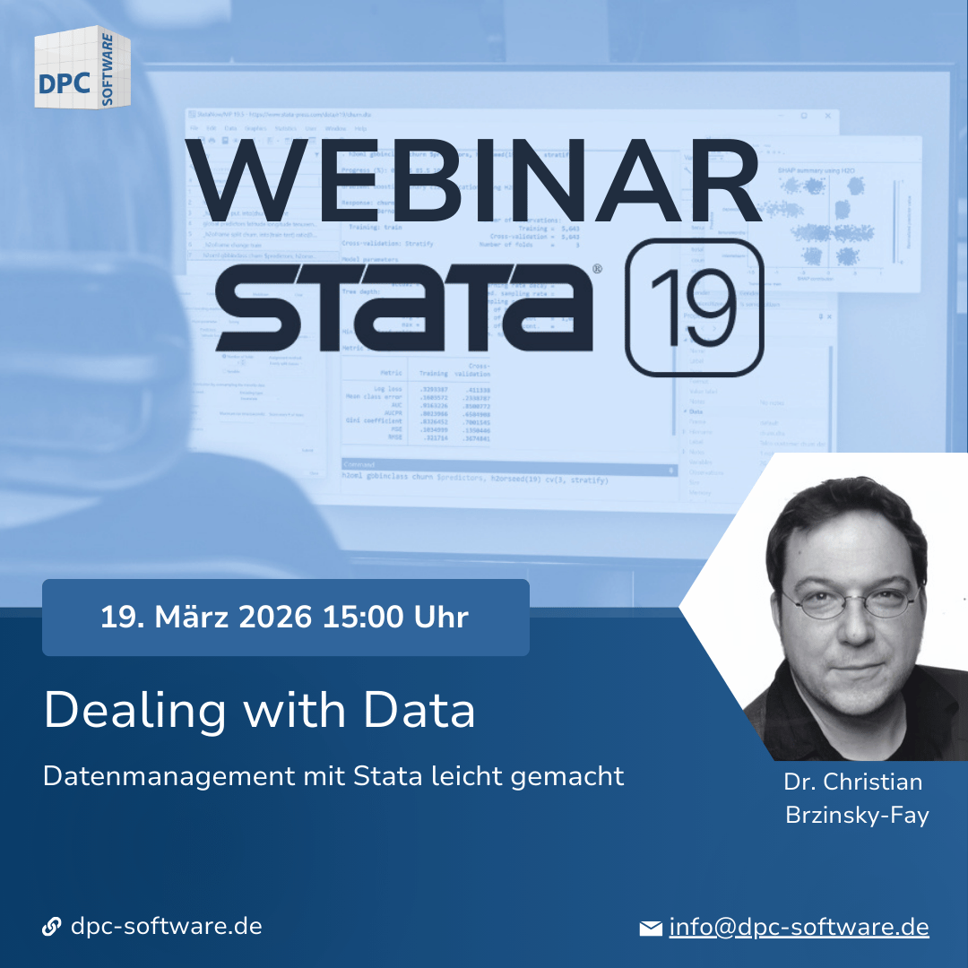 Bei der DPC Software GmbH stehen unsere Kunden im Mittelpunkt – daher bieten wir regelmäßig Webinare an, um neue Funktionen und Best Practices in Stata vorzustellen.